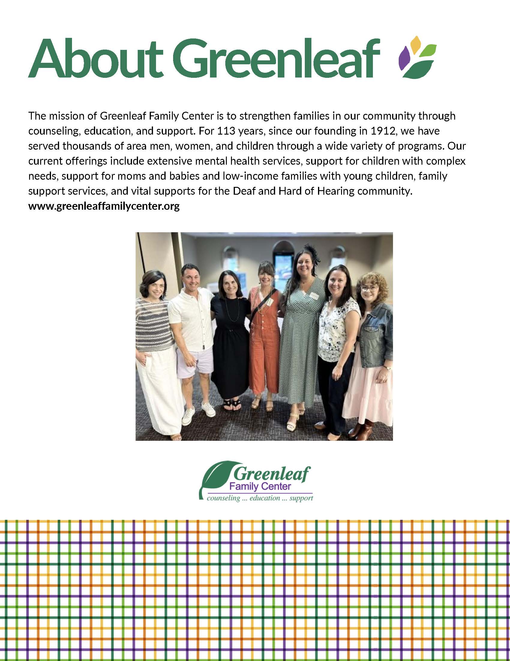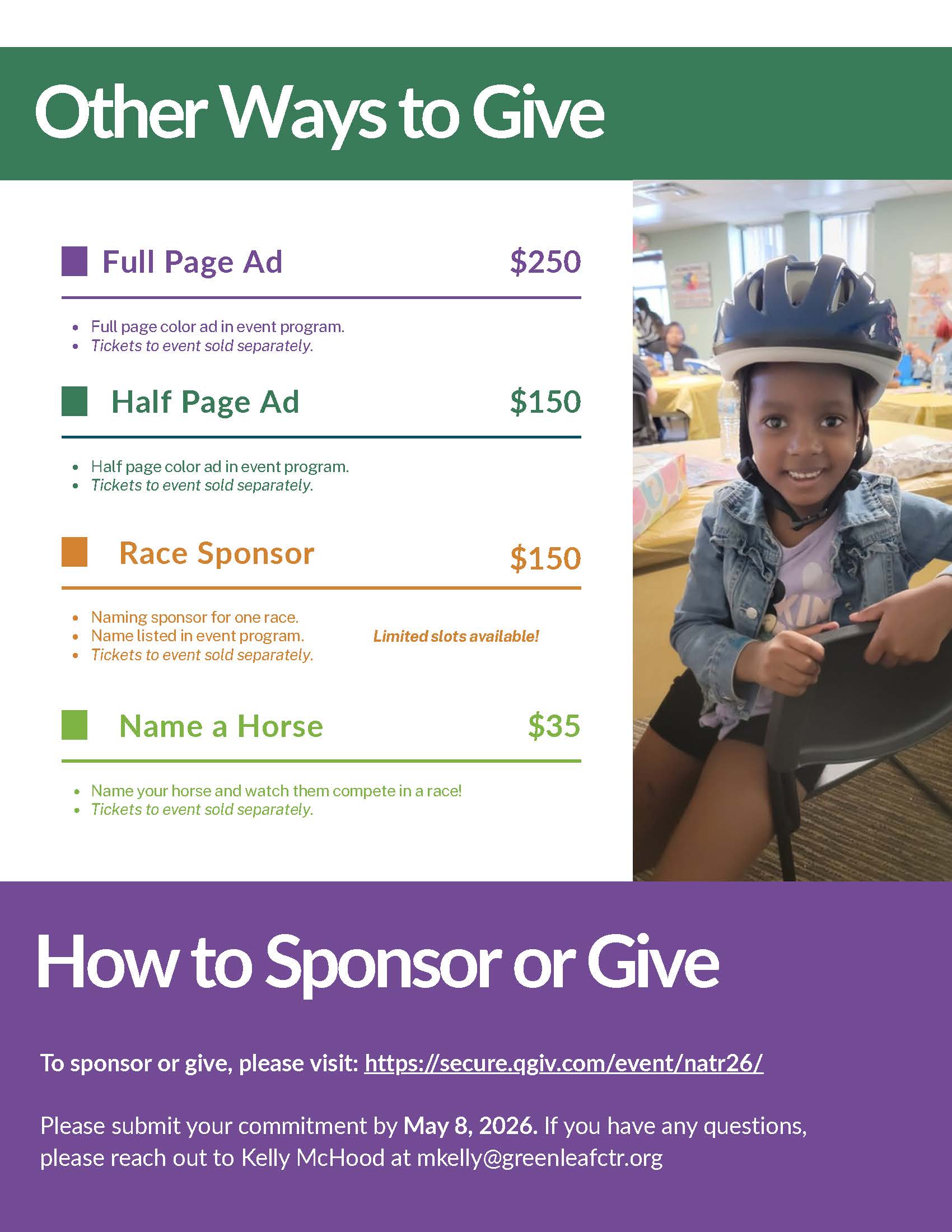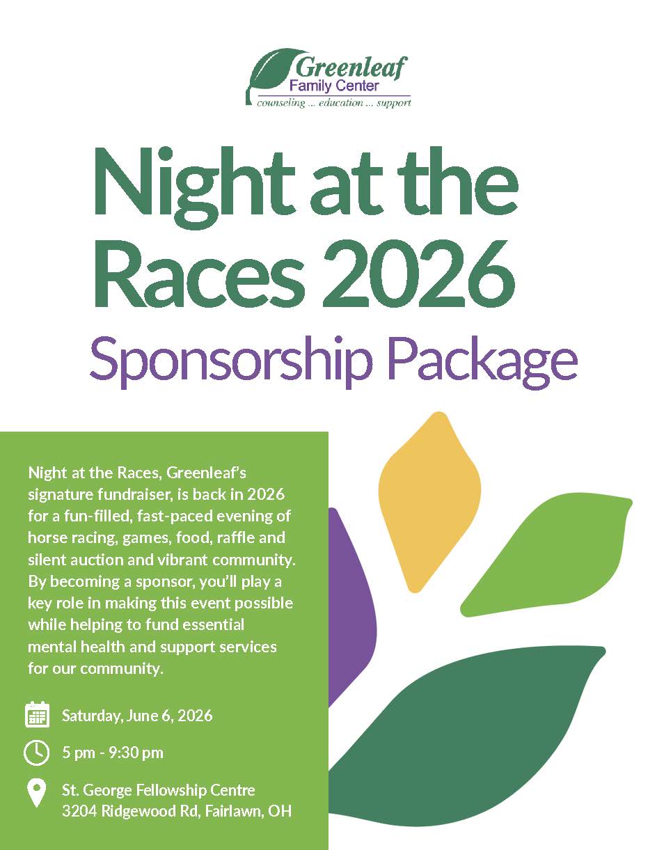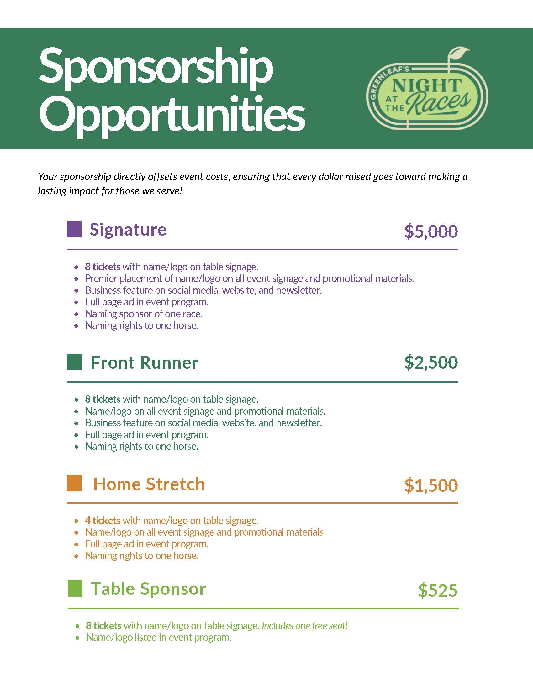 Sponsorships are key to the success of our Night at the Races annual fundraiser. Thank you to everyone who has been a sponsor, large or small, helping us raise hundreds of thousands of dollars as we plan our 18th event! For 2026, we've updated our sponsorship levels and benefits. See below and if you have any questions, email Kelly McHood at mkelly@greenleafctr.org.